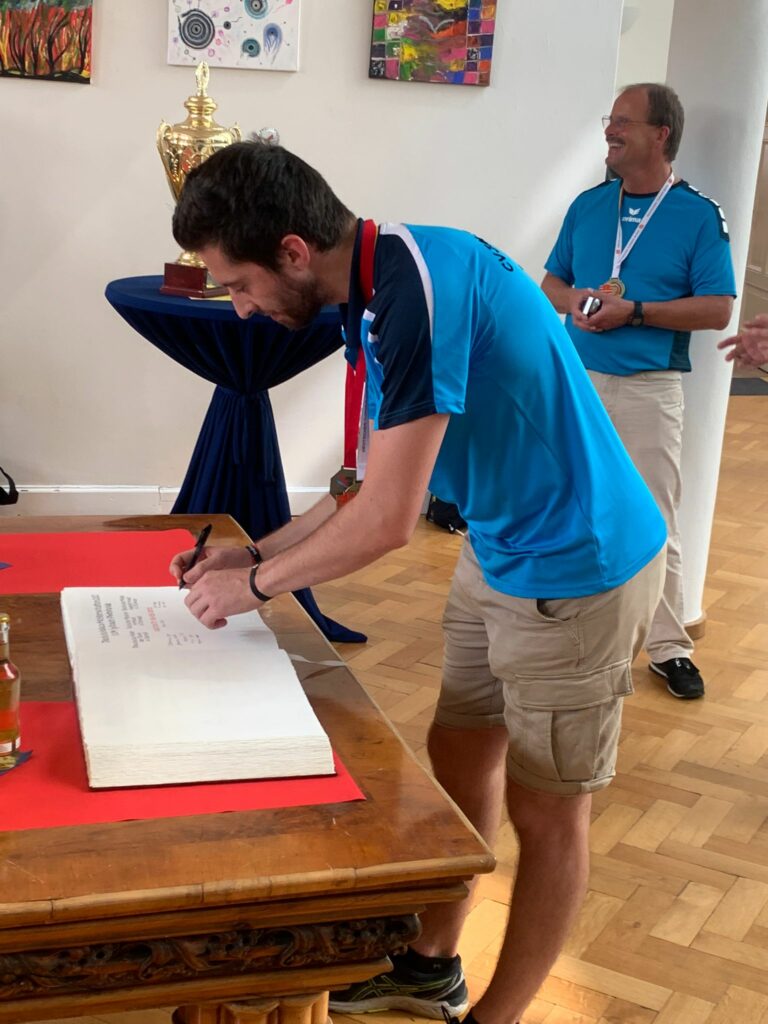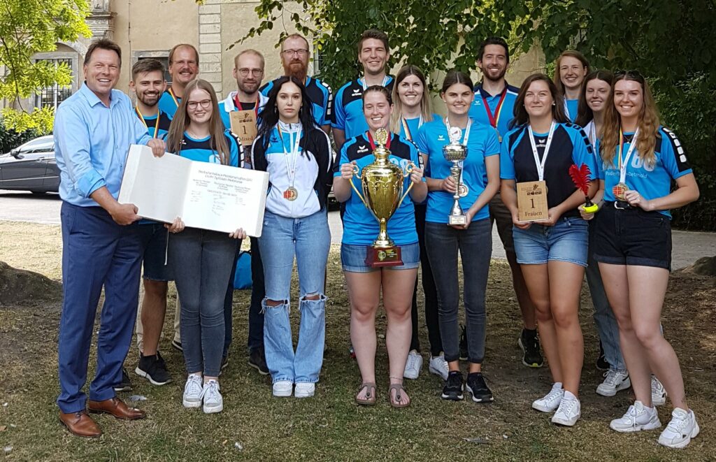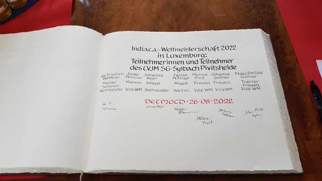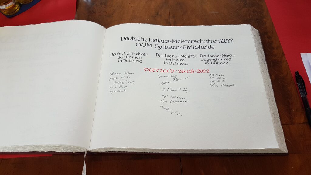 Der Bürgermeister Frank Hilker hat zum Empfang in das Rathaus der Stadt Detmold und zum Eintrag in das Goldene Buch eingeladen. Nach zwei Jahren der Pandemie und den damit verbundenen Schwierigkeiten im Trainings- und Spielbetrieb, ist die CVJM SG sehr gut im Spieljahr 2021/2022 unterwegs gewesen. Anfang Mai konnten die Jugendlichen der Altersklasse 15-18 Jahre zum dritten Mal in Folge die Deutschen Meisterschaften im DTB (Deutscher Turnerbund) in der Spielklasse Mixed erspielen. Zwei Wochen nach dem Erfolg der Jugend wurden die Deutschen Meisterschaften im DTB für die Erwachsenen vor heimischer Kulisse in Detmold ausgetragen. Die CVJM SG nutzte den Heimvorteil und schaffte es erstmalig im DTB die Spielklassen Mixed und Damen zu gewinnen. Der Bürgermeister war bei der DM vor Ort in der Halle und war begeistert von der Sportart Indiaca. Bei der Laudatio beim Empfang im Rathaus Detmold betonte Hilker, dass die Indiaca Abteilung der SG die beste Werbung für die Stadt Detmold und den Kreis Lippe in ganz Deutschland machen würde. Und nicht nur deutschlandweit waren die Spieler und Spielerinnen unterwegs. Zusätzlich konnten sich drei frischgebackene Indiaca Weltmeister und Weltmeisterinnen und drei Vizeweltmeister und Vizeweltmeisterinnen, sowie ein Nationalcoach der SG, in das Goldene Buch eintragen. Die Indiaca Weltmeisterschaften in sechs verschiedenen Spielklassen wurden im August in Luxemburg ausgespielt.